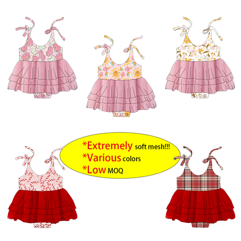 Vestido mameluco de una pieza con estampado personalizado para niñas pequeñas: lazos ajustables en los hombros, malla elástica extremadamente suave, MOQ bajo