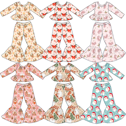 Conjunto navideño de Vestido de manga larga para niños con pantalones acampanados, diseño de encaje estampado personalizado, conjunto Premium para niñas