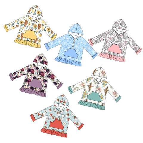 Sudaderas con capucha de manga larga de otoño-invierno con media cremallera para niñas pequeñas: bolsillo en la parte delantera, volantes de moda y estilos estampados